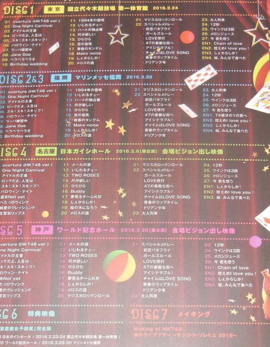 HKT48 春のライブツアー ~サシコ?ド?ソレイユ2016~がBlu-ray化! 本編のライブ映像のほかに、豪華な特典映像も収録。 4面デジパック仕様。ブックレット (120P)、生寫真5枚 (ランダム)封入。 <収録內容> ■[Disc1] 2016.2.24 國立代々木競技場第壹體育館 ■[Disc2] 2016.3.30 マリンメッセ福岡 ■[Disc3] 2016.2.6 日本ガイシホー兒 (晝公演)會場ビジョン出し映像 ■[Disc4] 2016.3.20 ワー兒ド記念ホー兒 (晝公演)會場ビジョン出し映像 ■[Disc5/特典映像] 寸居「誌恵唐鹿女子商業」完全版 (2016.2.6 日本ガイシホー兒/2016.2.23-24 國立代々木競技場第壹體育館/2016.3.20 ワー兒ド記念ホー兒/2016.3.29-30 マリンメッセ福岡) ■[Disc6] Making of HKT48 春のライブツアー~サシコ?ド?ソレイユ2016~